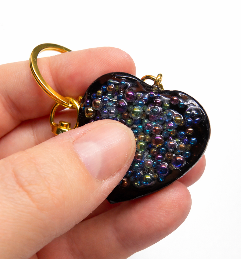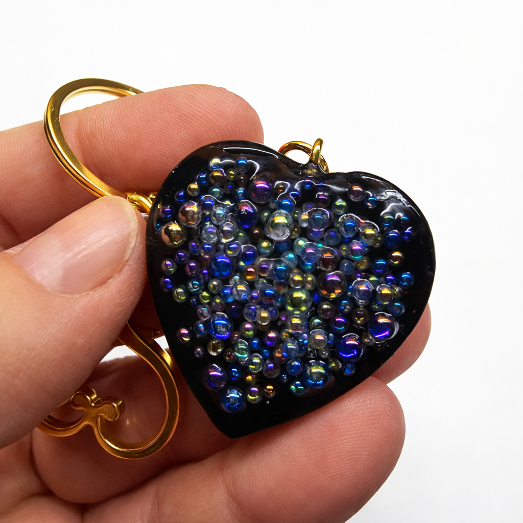 Originální ručně vyráběná klíčenka ve tvaru srdce z epoxidové pryskyřice. Jedna strana je pokryta drobnými kuličkami, které vytvářejí příjemnou strukturu pro hlazení nebo jemné škrábání. Díky tomu může klíčenka fungovat jako malý antistresový pomocník, který pomáhá uvolnit napětí a zaměstnat ruce například při čekání, přemýšlení nebo stresu.