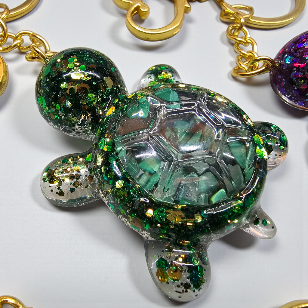 Ručně vyrobená klíčenka ŽELVA. Uvnitř želvičky jsou kamínky Malachitu.