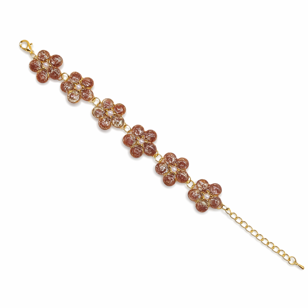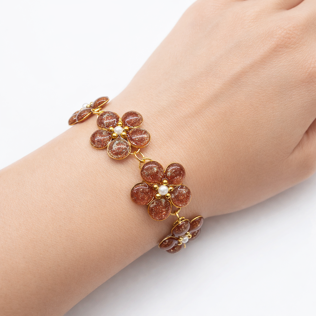 Jemný a originální náramek, který vznikl poctivou ruční prací. Každý květ je vytvořen z epoxidové pryskyřice a doplněn drobnou perličkou uprostřed, která šperku dodává něžný a elegantní vzhled. Díky ruční výrobě je každý kus jedinečný – drobné detaily a struktura pryskyřice dělají z každého náramku malý originál.