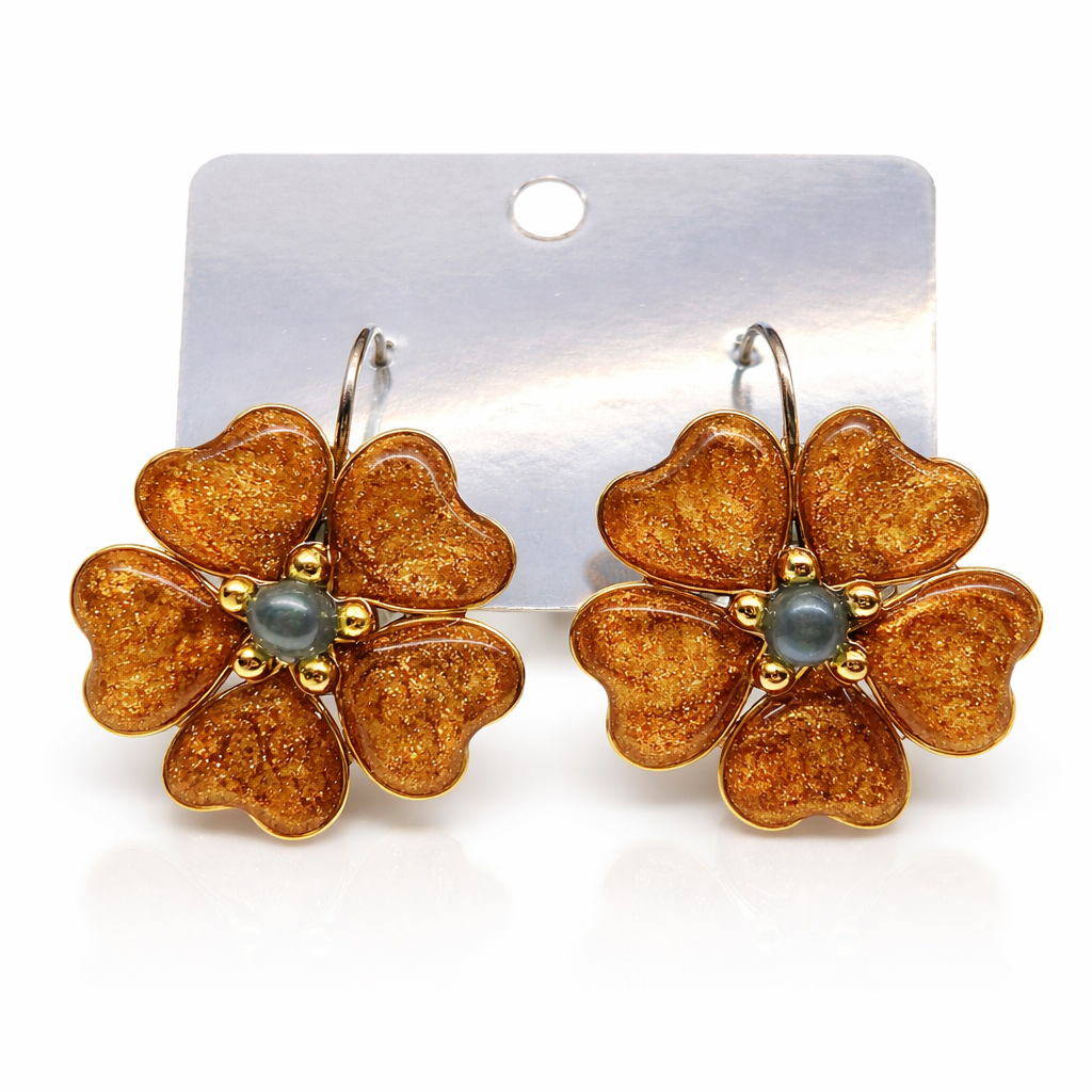 Ručně vyrobené náušnice ve tvaru květiny.Zapínání z nerez oceli - háček. Uprostřed malý kamínek Křišťálu Aqua aura.