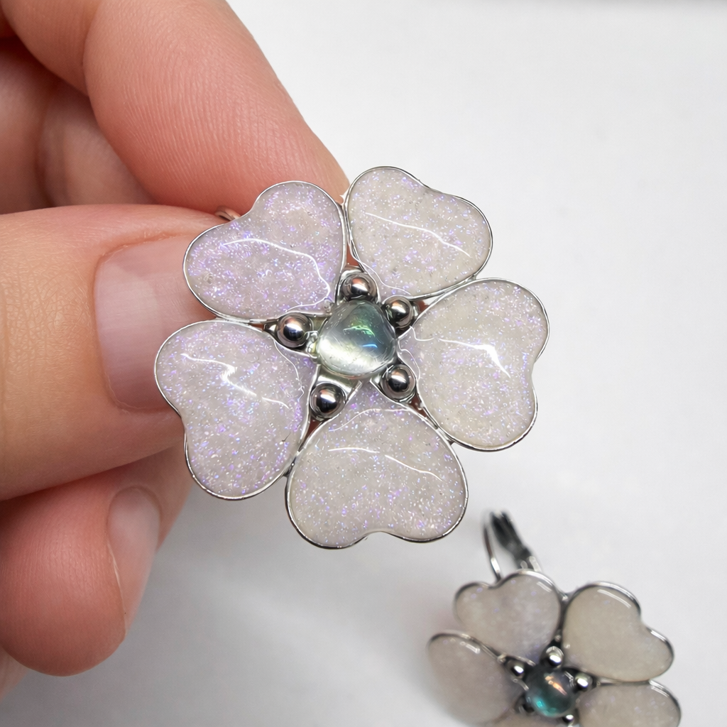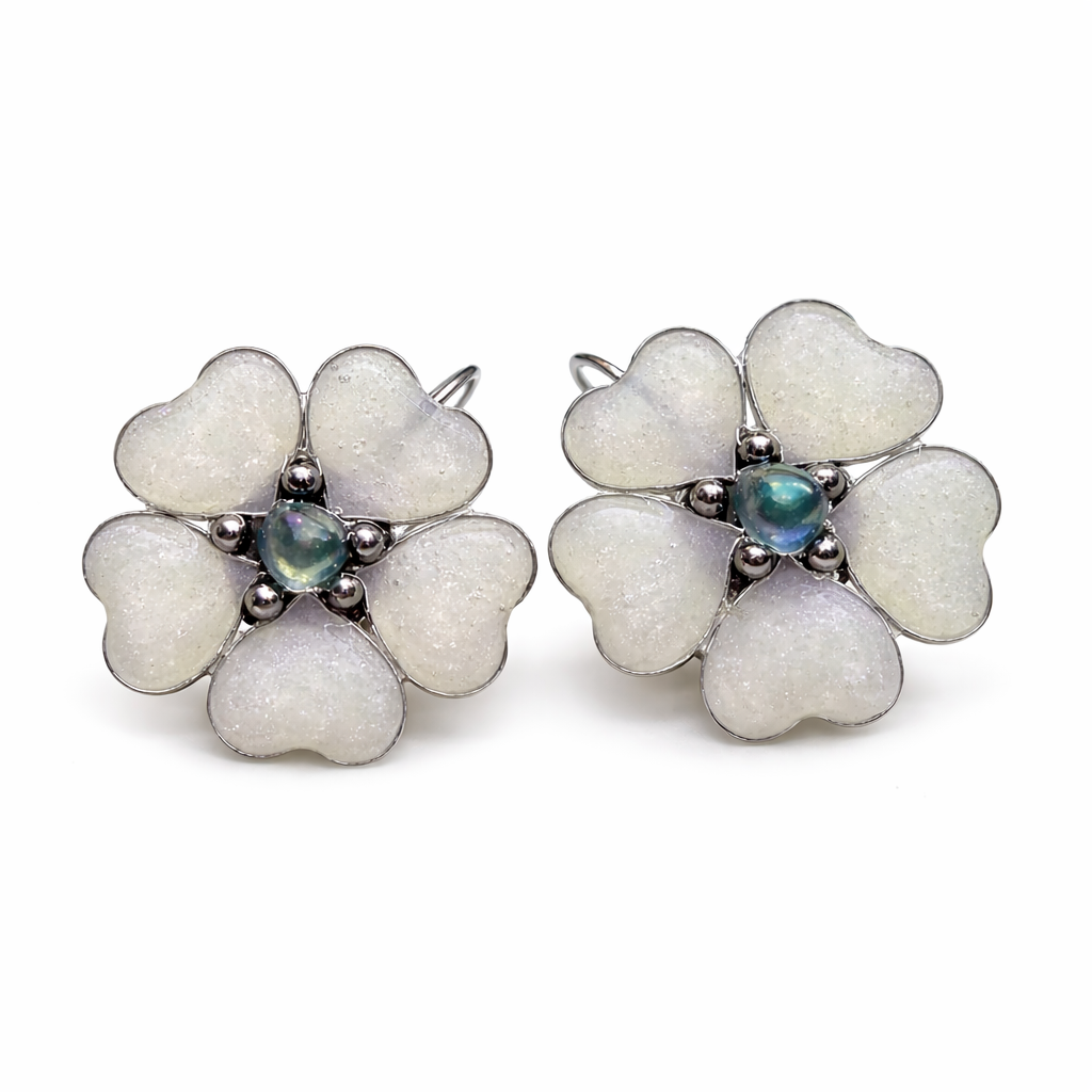 Ručně vyrobené náušnice ve tvaru květiny.Zapínání z nerez oceli - háček. Uprostřed malý kamínek Křišťálu Aqua aura.