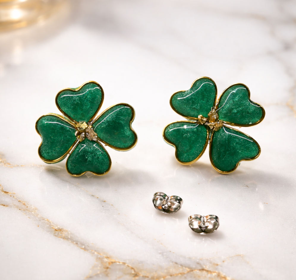 Ručně vyrobené náušnice ve tvaru čtyřlístku.Část do ucha je z nerez oceli.