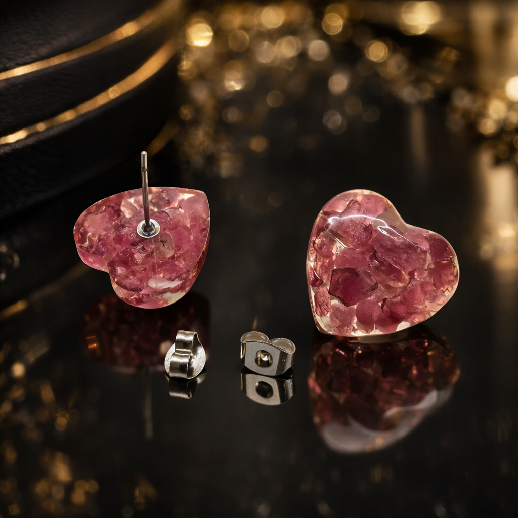 Ručně vyrobené náušnice ve tvaru srdce s kameny pravého Rubelitu.