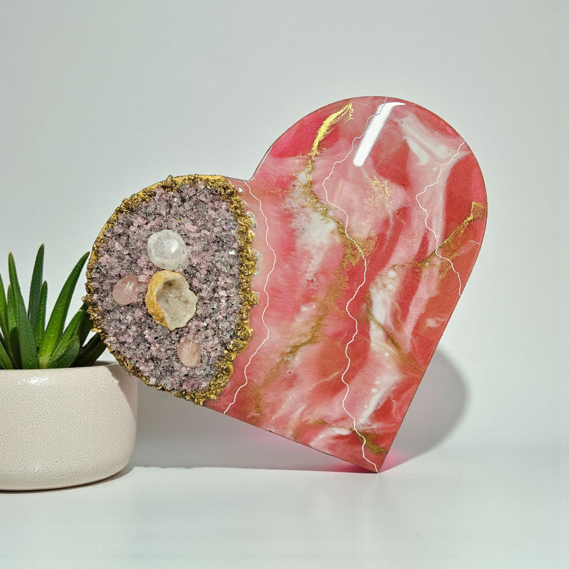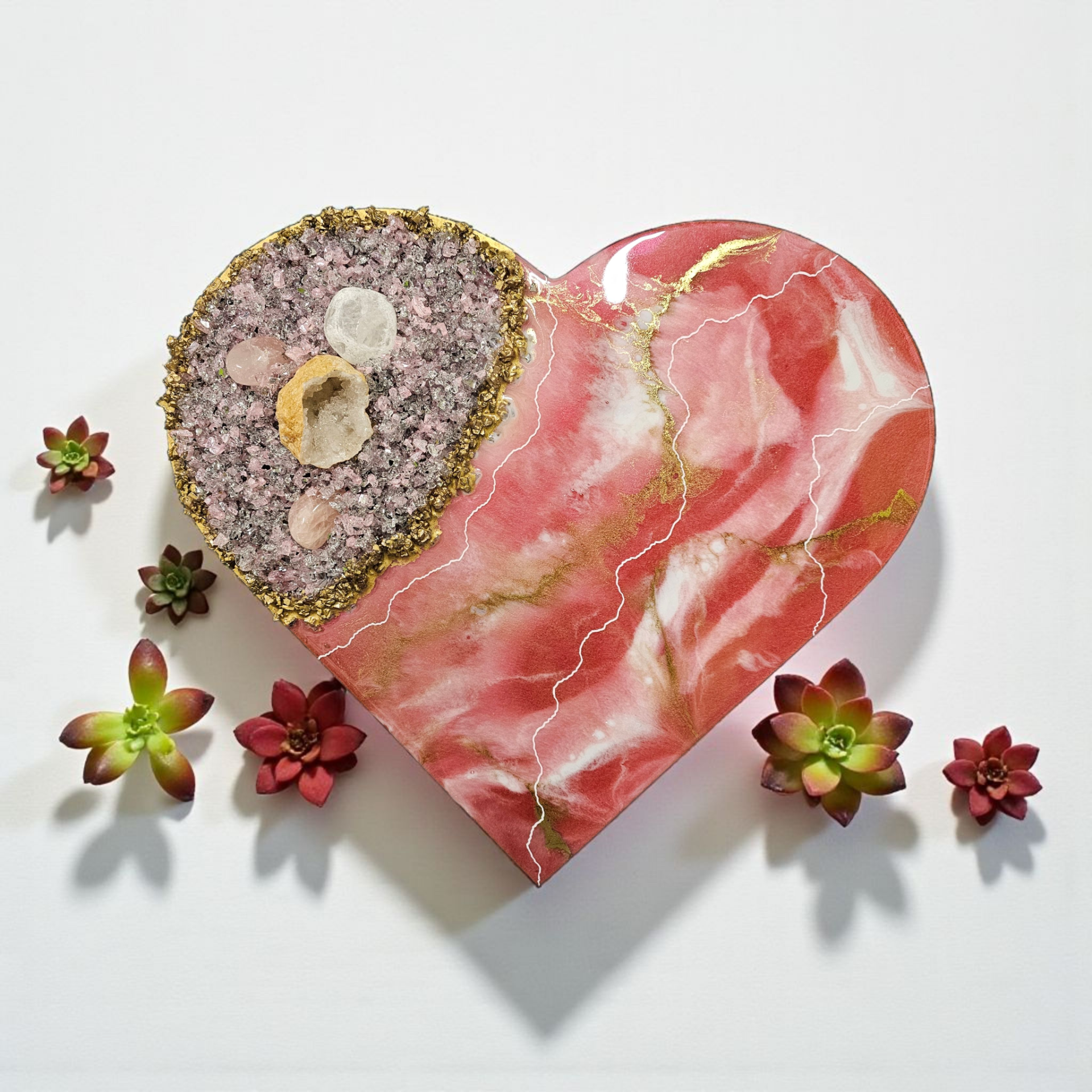Ručně vyrobený obraz v designu geody ve tvaru srdce.