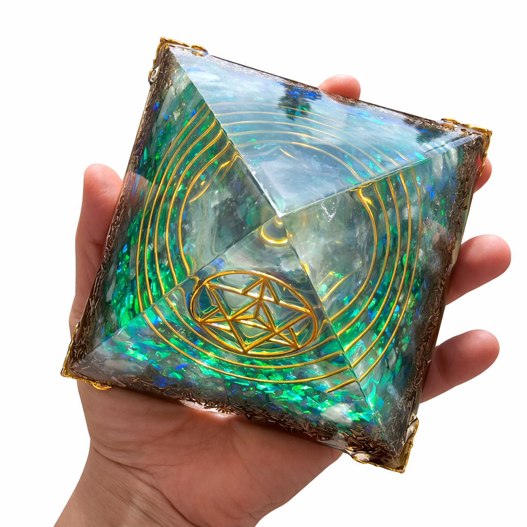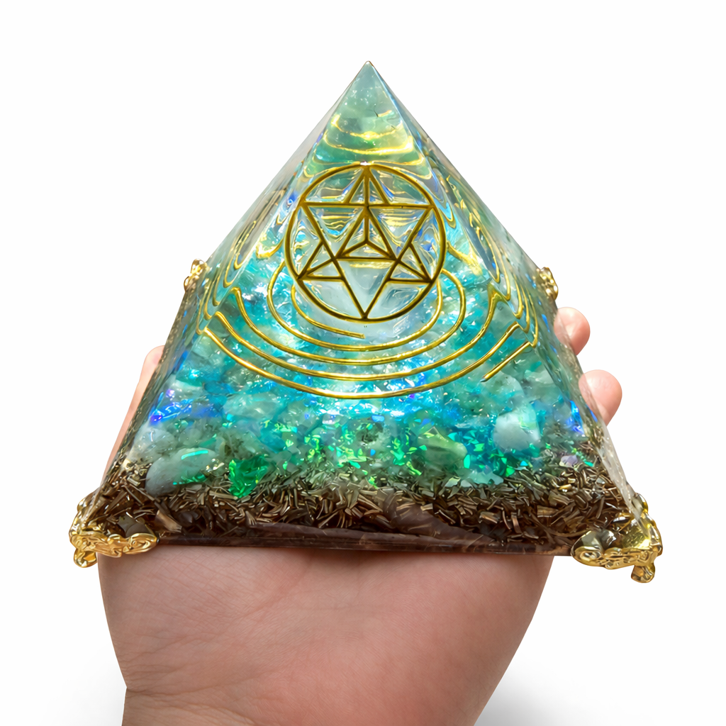 Orgonitová pyramida - v zakladu je velký krystal Křišťálu Aqua aura, Citrín. Symbol Merkaba a zlatá spirála.