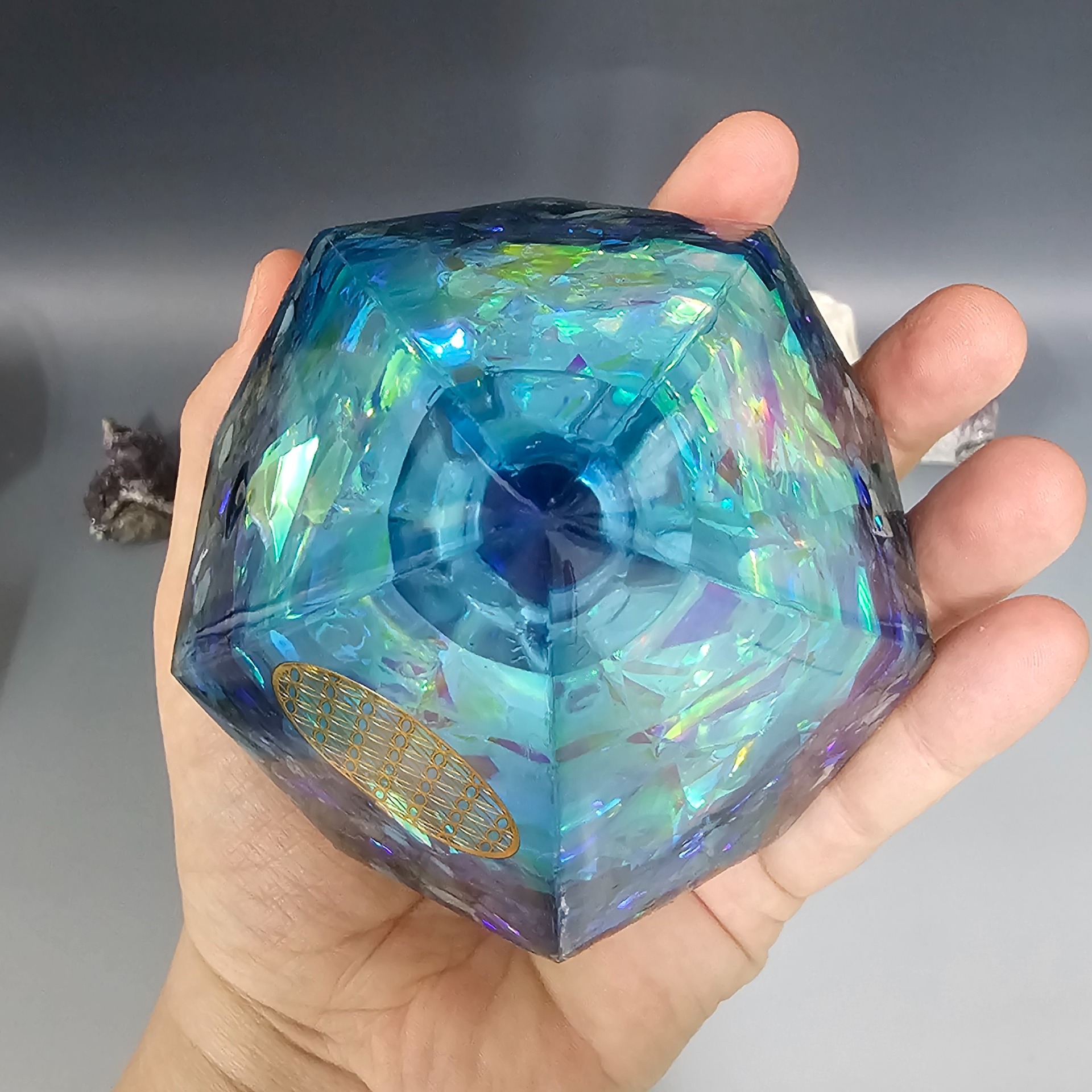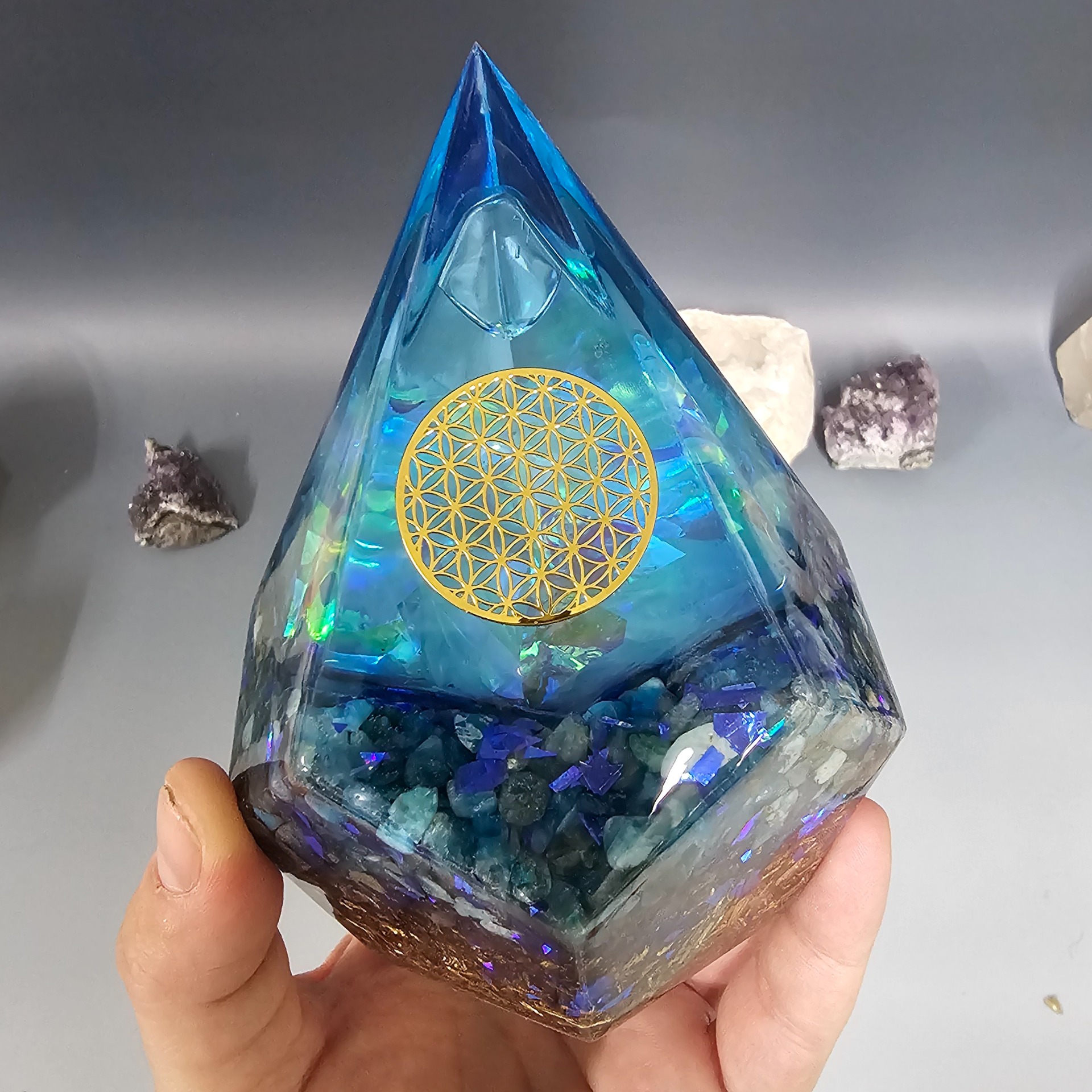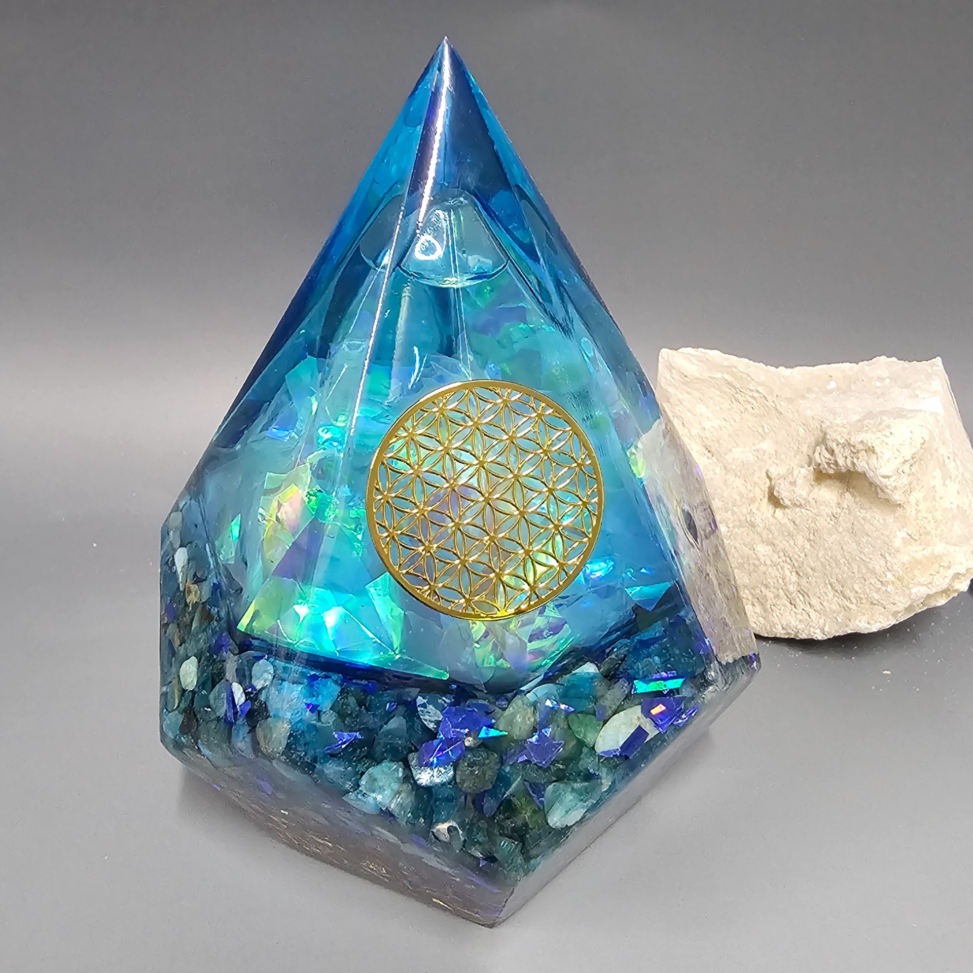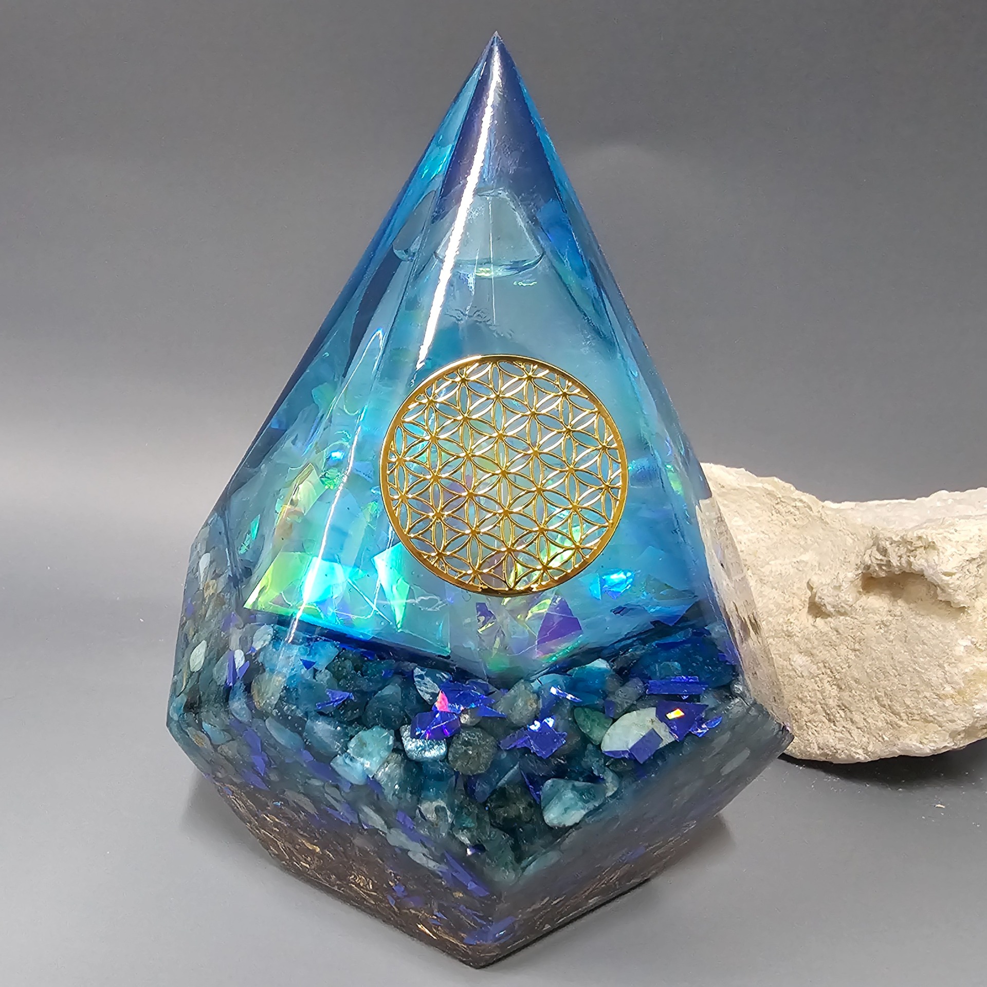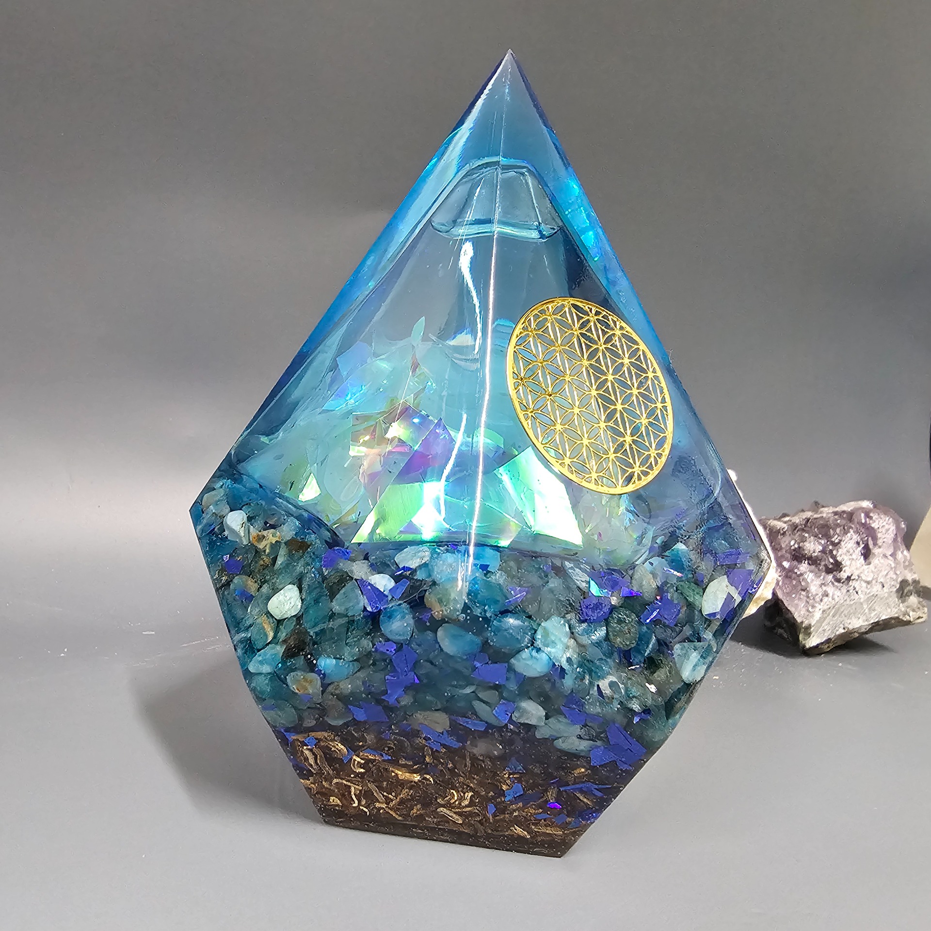 Orgonitový jehlan s tekutým jádrem, výška 11 cm, Křišťál, Lapis Lazuli, symbol Květ života