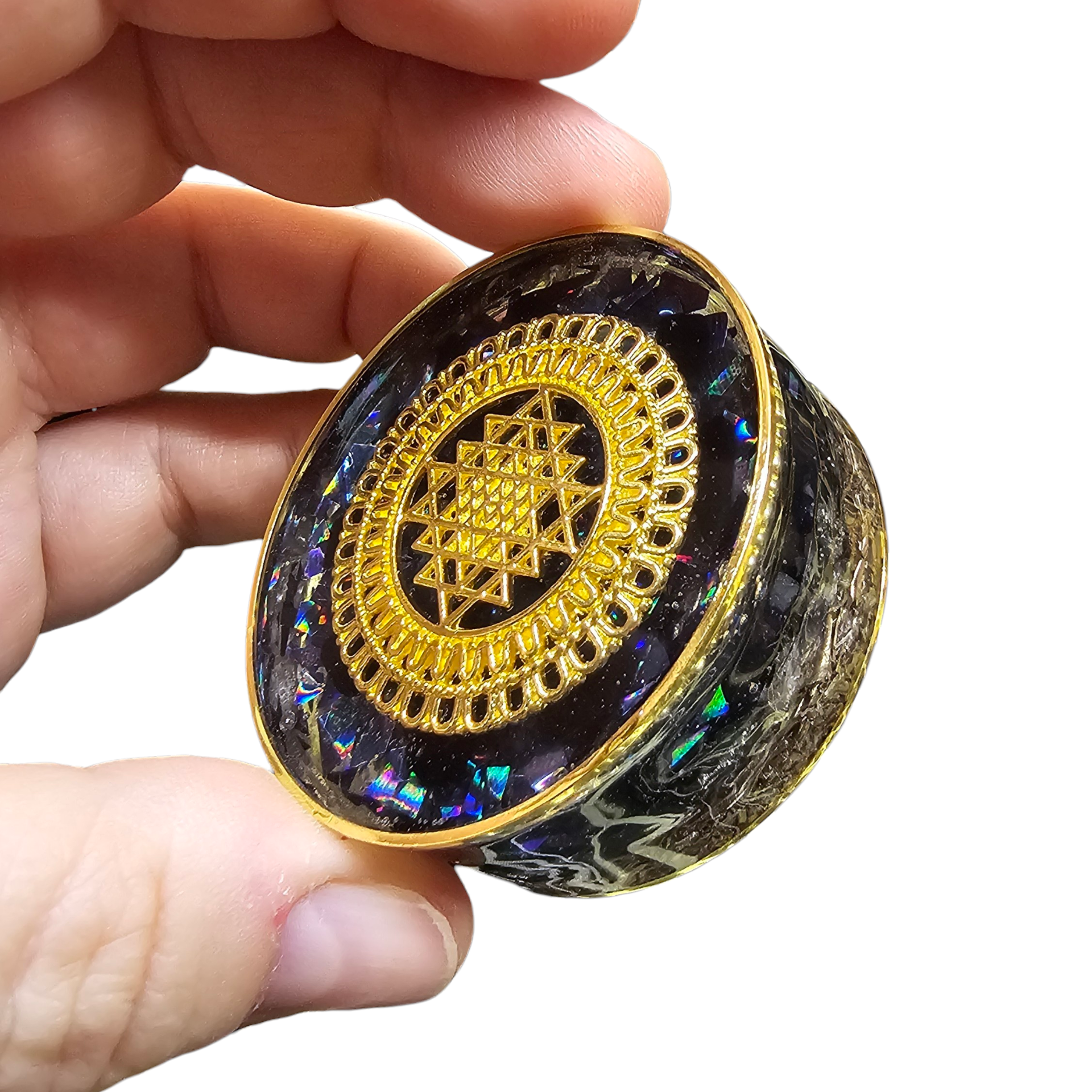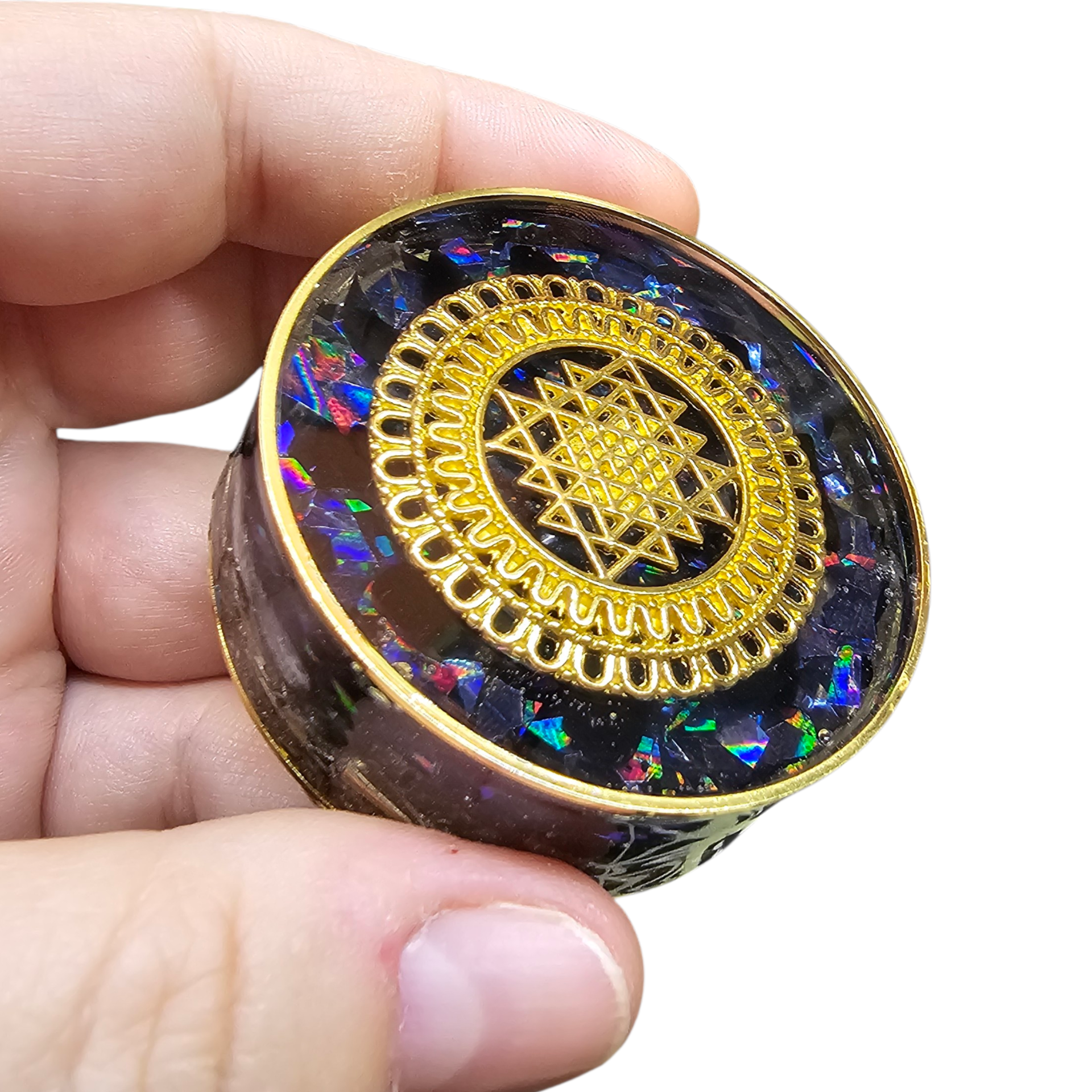 Orgonitový puk - Křišťál, Pyrit, Turmalín, symbol Srí Yantra