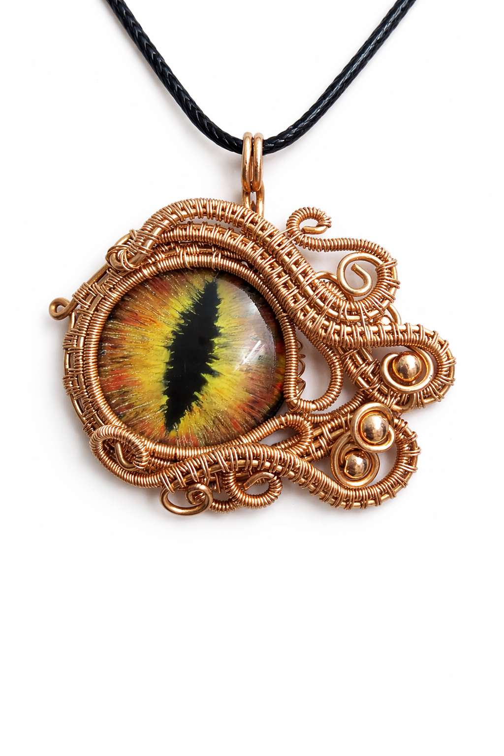 Přívěsek dračí oko s autorským ručně malovaným kabošonem oko.Drátek leštěná surová měd.Černá šňůrka součástí šperku.