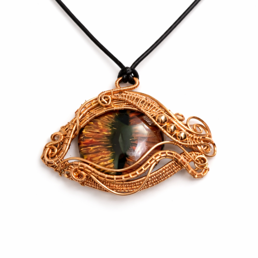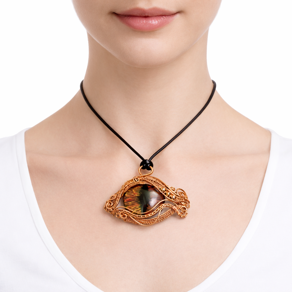 Přívěsek dračí oko s autorským ručně malovaným kabošonem oko.Drátek leštěná surová měd.Černá šňůrka součástí šperku.