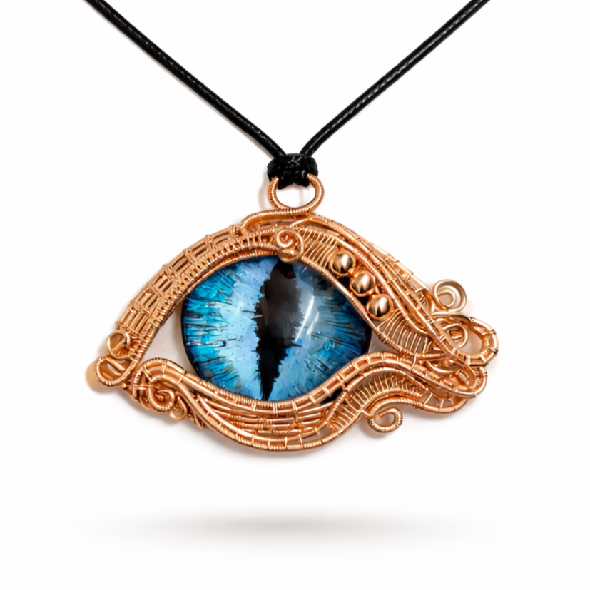 Přívěsek dračí oko s autorským ručně malovaným kabošonem oko.Drátek leštěná surová měd.Černá šňůrka součástí šperku.