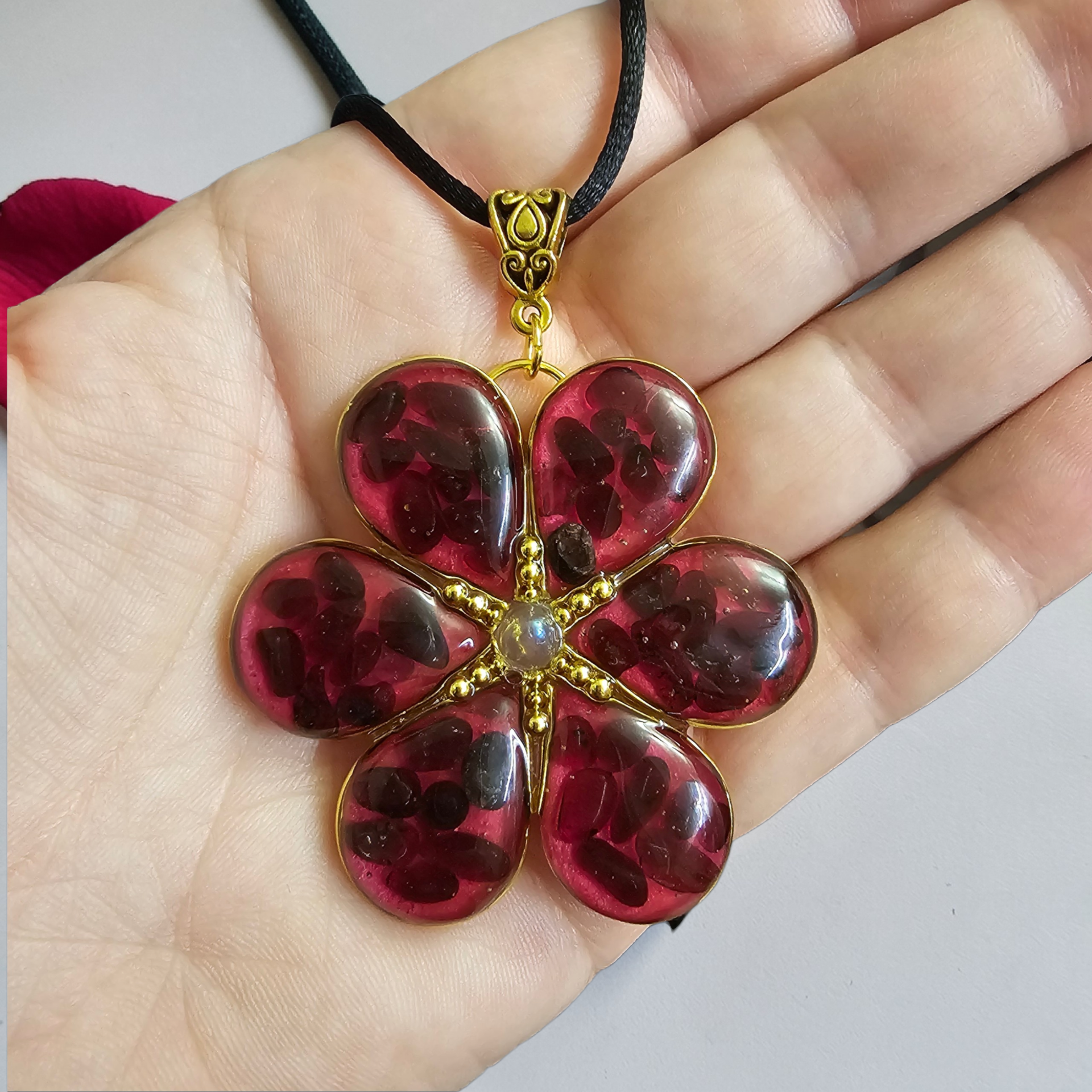 Ručně vyrobený přivesek ve tvaru květiny. Uvnitř kamínky pravého Granátu.