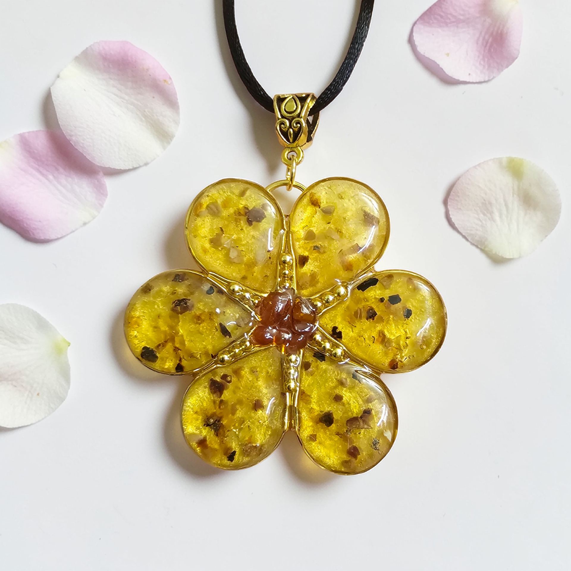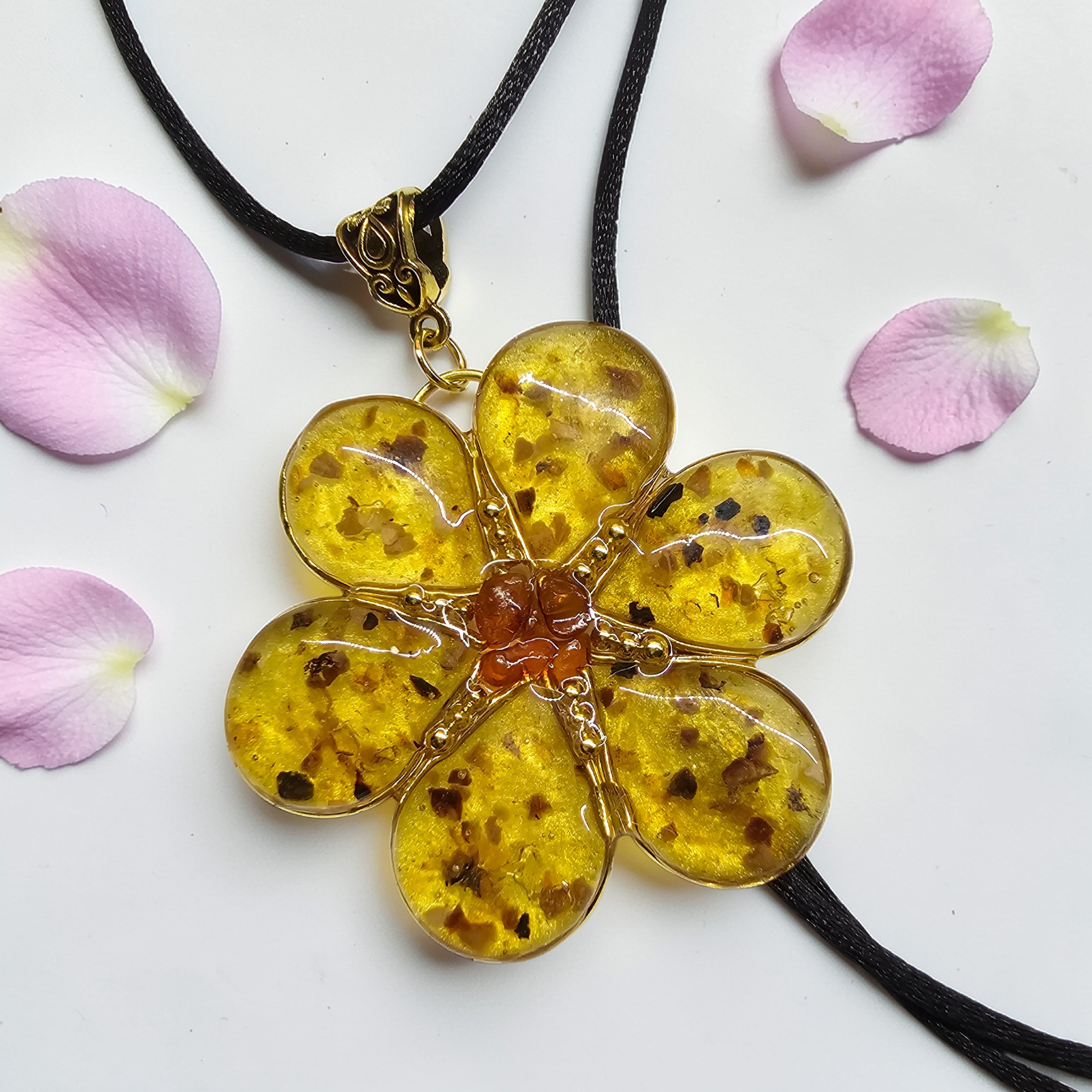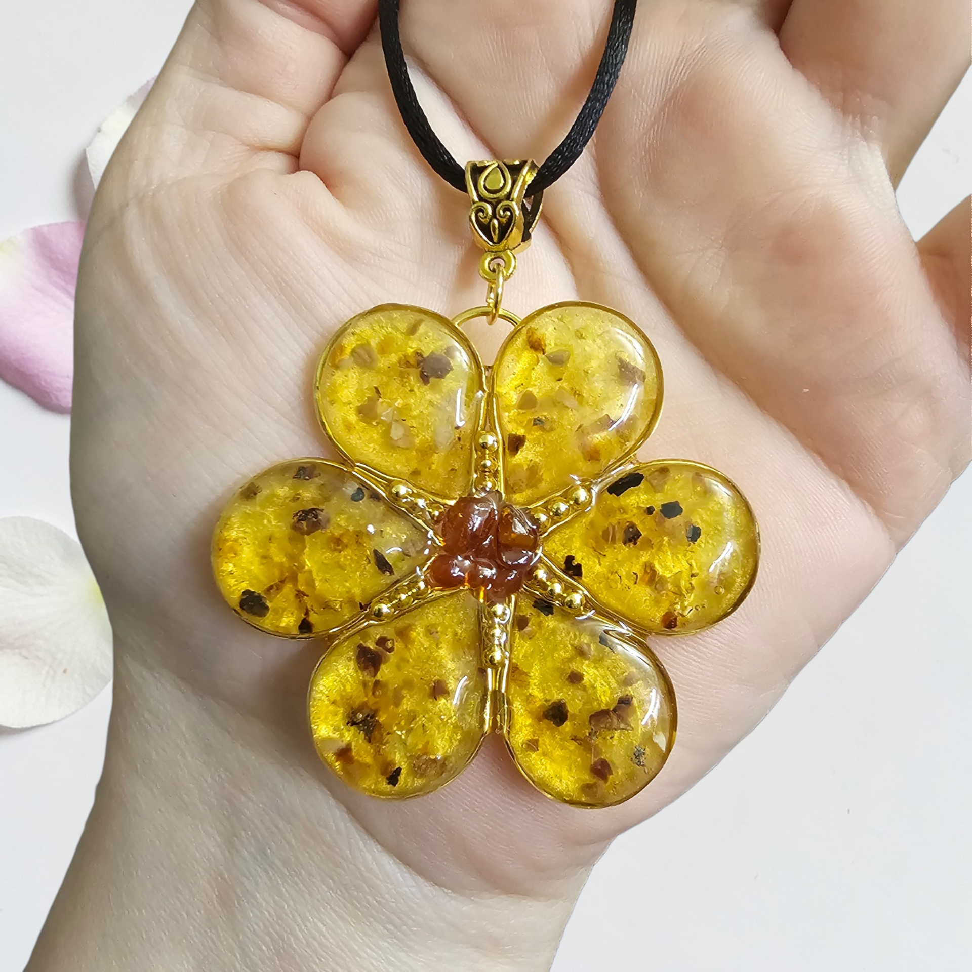 Ručně vyrobený přivesek ve tvaru květiny. Uvnitř kamínky pravého Jantaru.