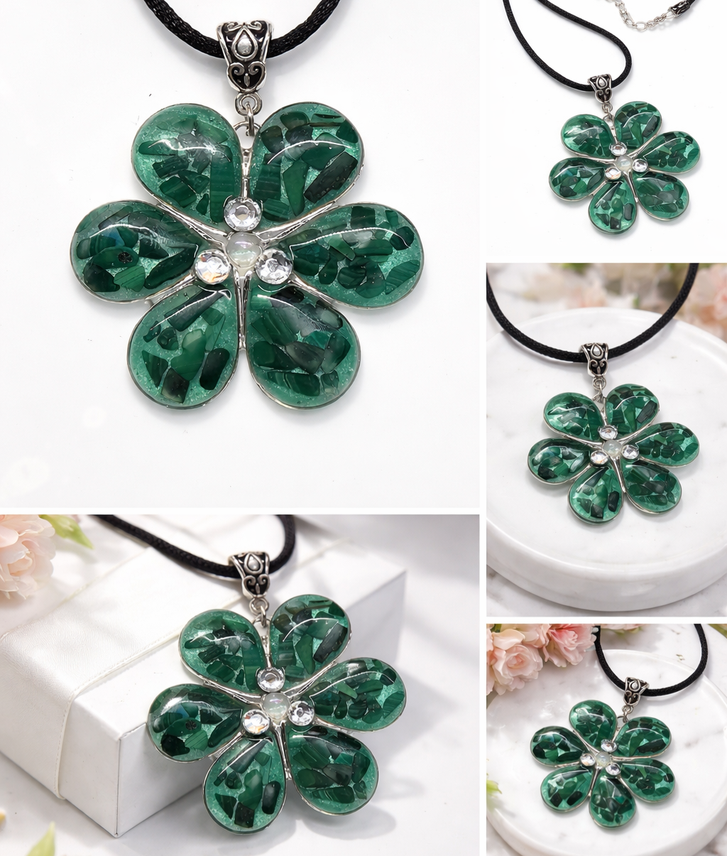 Ručně vyrobený přivesek ve tvaru květiny. Uvnitř kamínky pravého Malachitu, uprostřed malý kamínek Aqua aura Křišťálu.