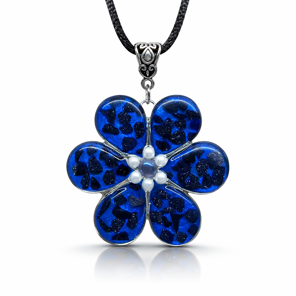 Ručně vyrobený přivesek ve tvaru květiny. Uvnitř kamínky pravého modrého Avanturínu, uprostřed malý kamínek Aqua aura Křišťálu.