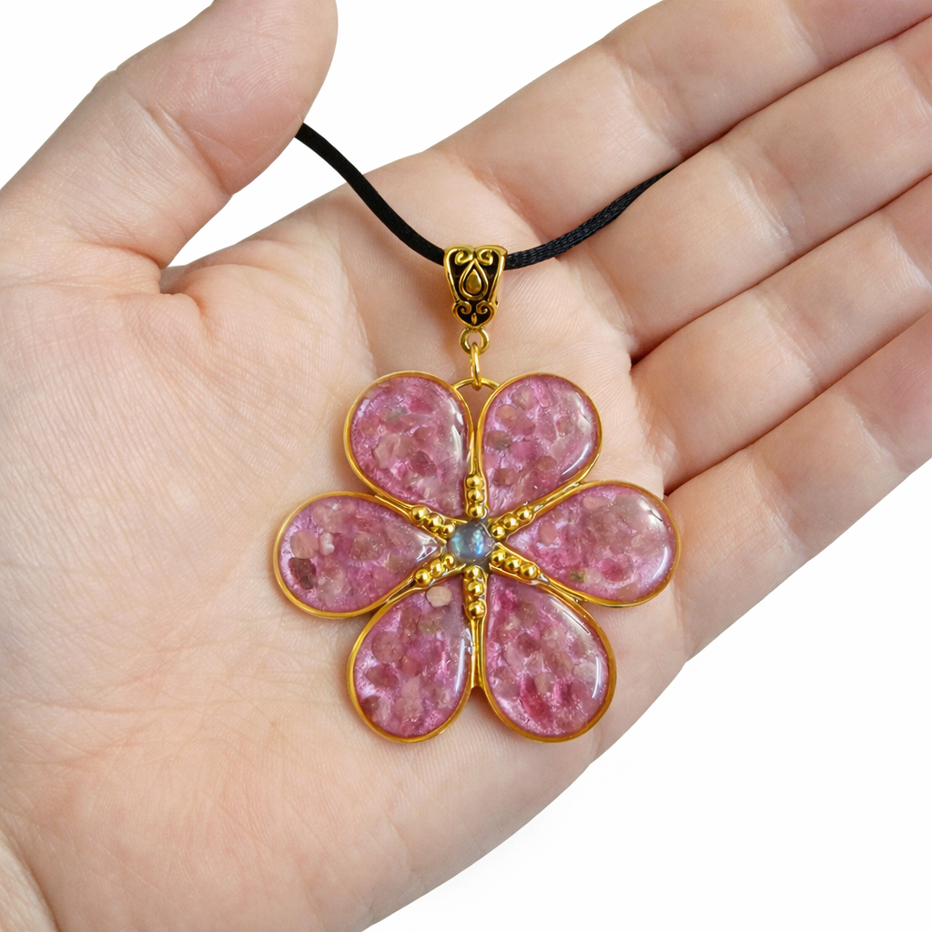 Ručně vyrobený přivesek ve tvaru květiny. Uvnitř kamínky pravého Rubelitu, uprostřed malý kamínek Aqua aura Křišťálu.