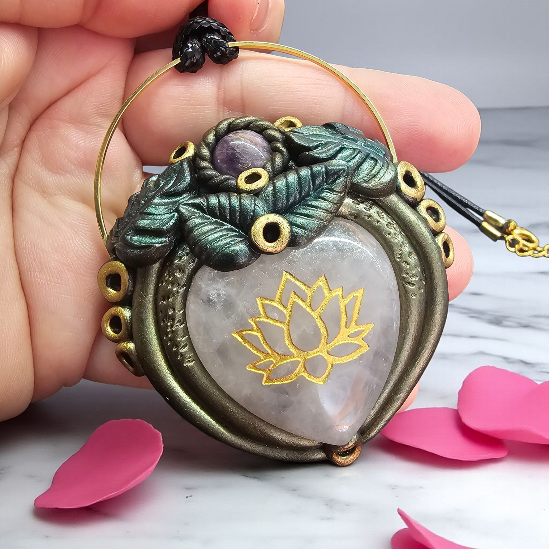 Ručně vyrobený přívěsek z polymerové hmoty.V přívěsku jsou dva kameny - Růženín a Ametyst.