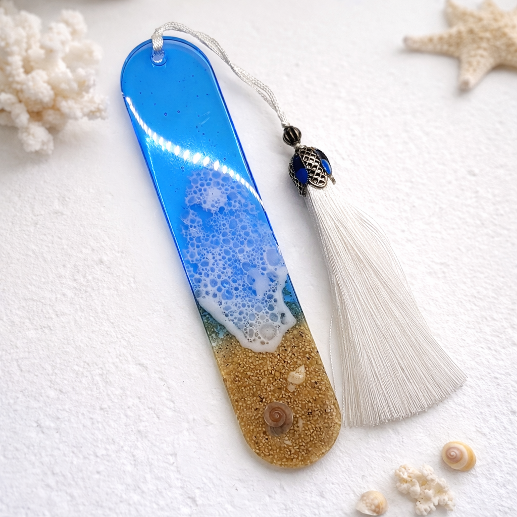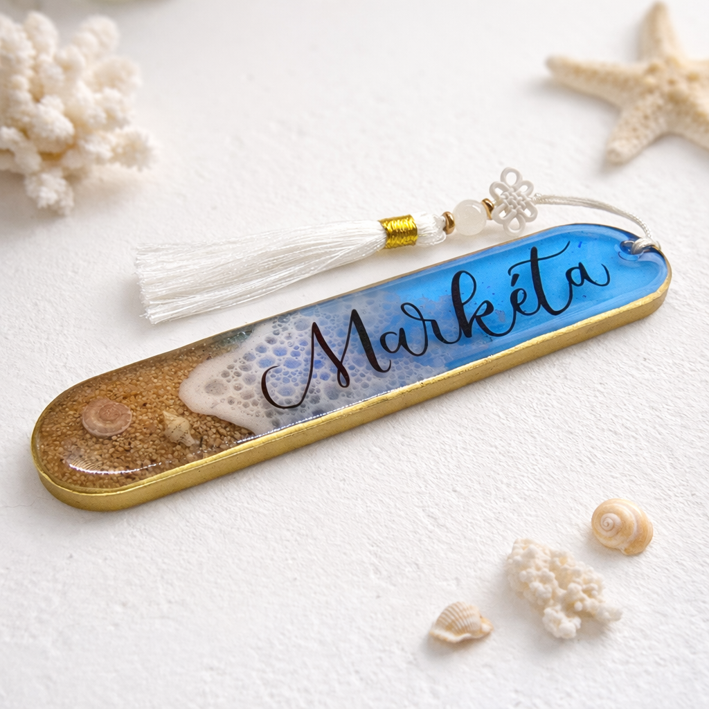 Do zprávy v objednávce napište, zda chcete záložku čistě jen moře, pokud chcete záložku se jménem, uveďte jméno. Zlatý lem ANO/NE.